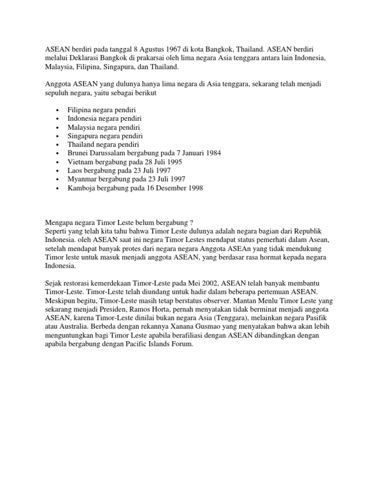 ASEAN beranggotakan 10 negara yakni Indonesia Malaysia Singapura Thailand Filipina Brunei Darussalam Vietnam Laos Myanmar dan Kamboja. Organisasi ASEAN didirikan oleh 5 negara. Latihan ini diharapkan dapat membantu orang tua dalam membimbing anak-anaknya selama proses pembelajaran di rumah.